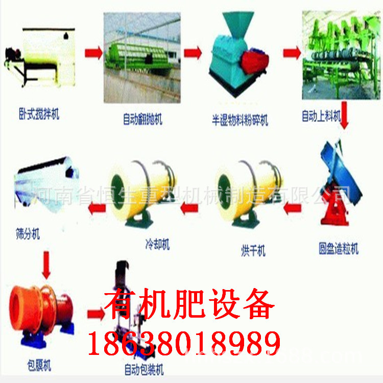 ①原料发酵---②原料粉碎----③原料自动配料系统----④混料-----⑤有机肥造粒、滚筒造粒、挤压造粒、圆盘造粒、复合式造粒(多种有机肥造粒设备可选择)-----⑥烘干机烘干有机肥颗粒(烘干热源